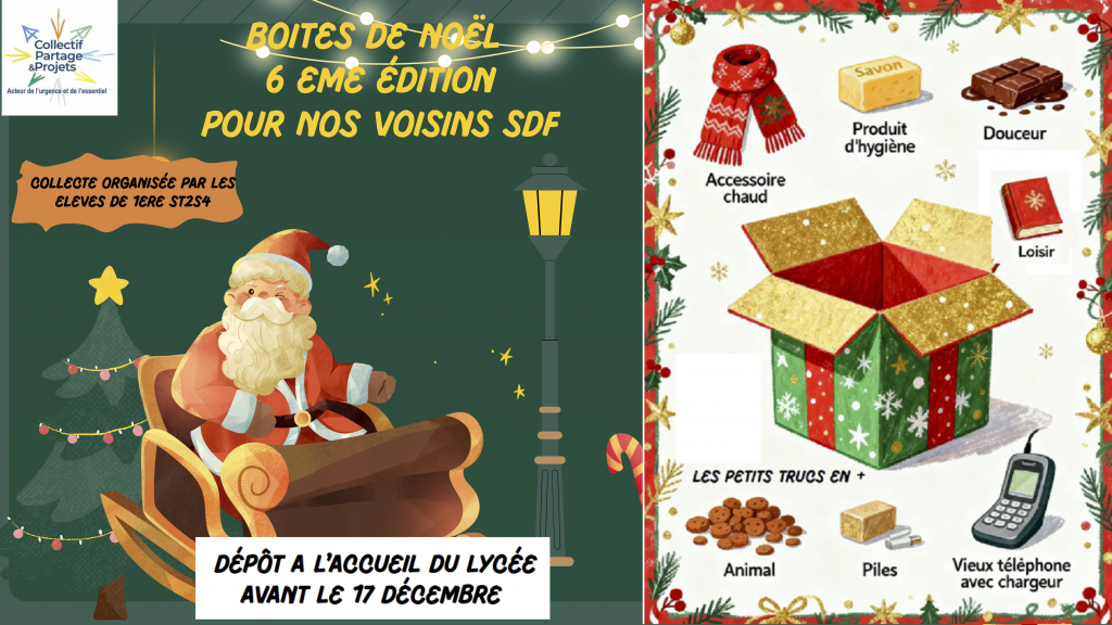 📅 Dépôt des boîtes : à l’accueil du lycée, jusqu’au 17 décembre.