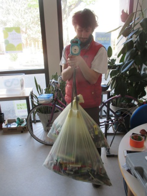 Pour donner droit à des points, les colis envoyés doivent peser au minium 20 kilos. Nous avons profité de la semaine du développement durable pour communiquer sur cette opération et effectuer une nouvelle pesée. Nous en étions à 6,5 kilos en février. Nous en sommes maintenant à plus de 14 kilos. Continuez à faire le tri dans vos trousses et vos tiroirs et venez déposer votre butin dans une des boites prévues à cet effet (salle des professeurs, vie scolaire, CDI , salle Agenda 21,…)